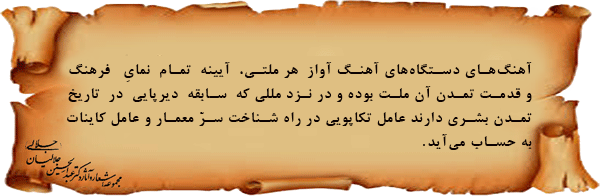 آهنگهای دستگاههای آهنگ آواز هر ملتی، آیینه تمام نمایِ فرهنگ و قدمت تمدن آن ملت بوده و در نزد مللی که سابقه دیرپایی در تاریخ تمدن بشری دارند عامل تکاپویی در راه شناخت سرّ معمار و عامل کاینات به حساب میآید.