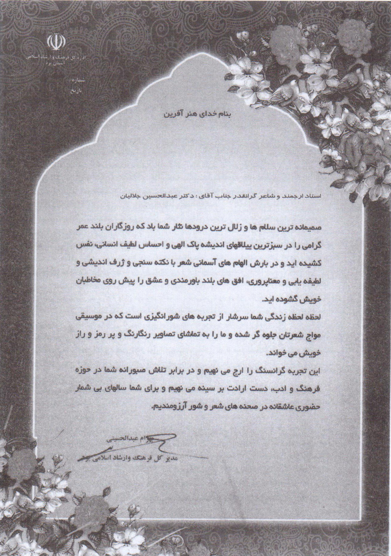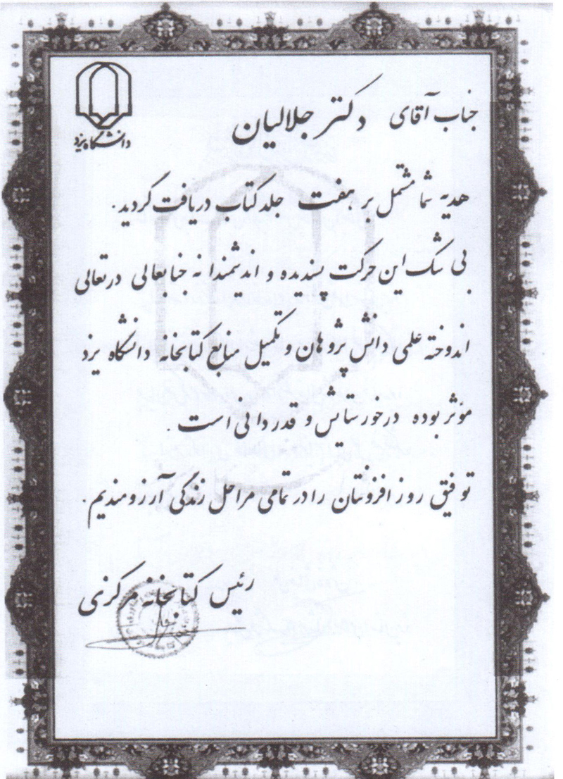 به اطلاع شما عزیزان می رسانیم صفحه جدید افتخارات و تقدیرهای استاد جلالیان به سایت اضافه گردیده است که لینک آن در زیر ضمیمه می گردد.